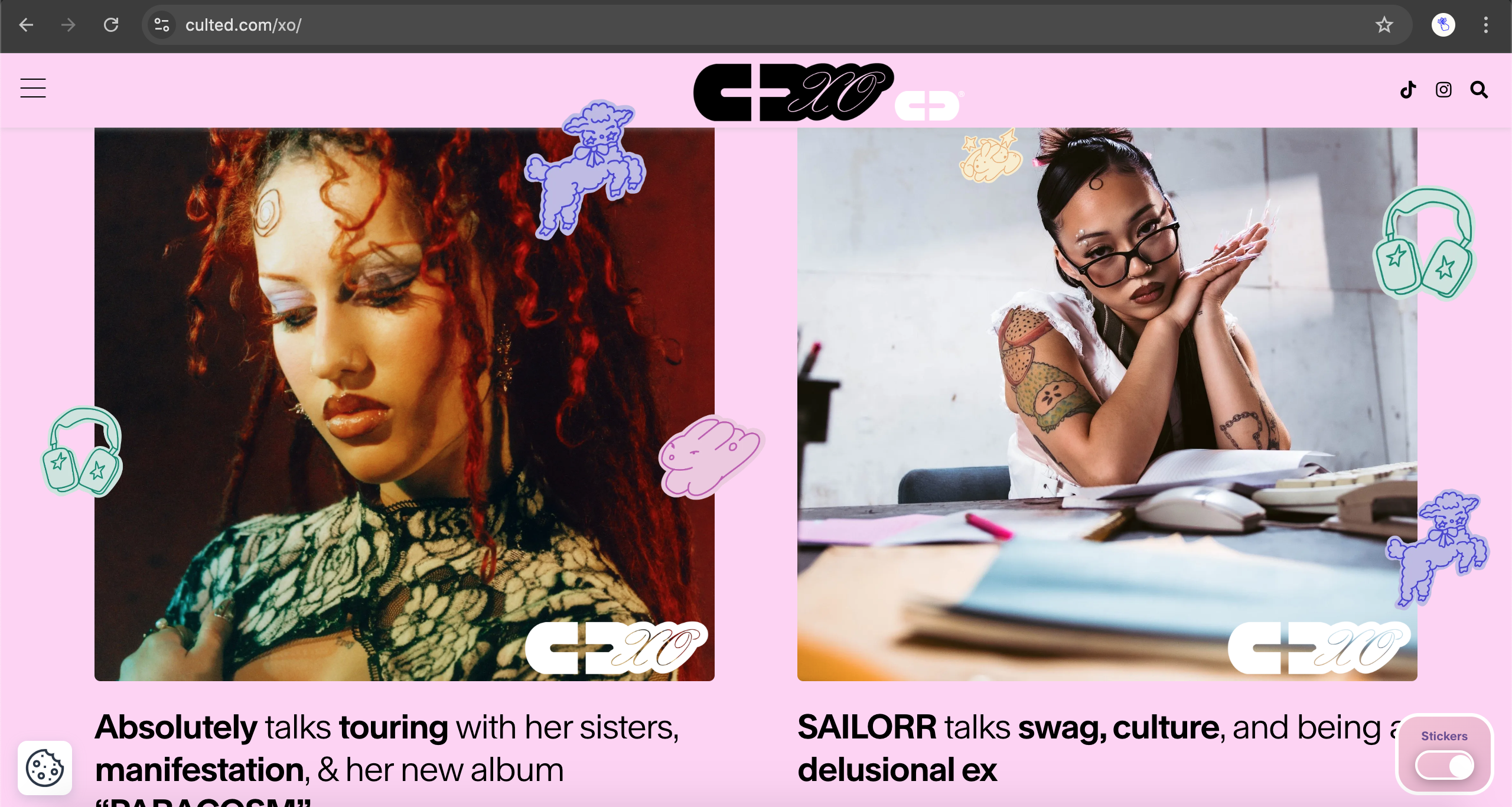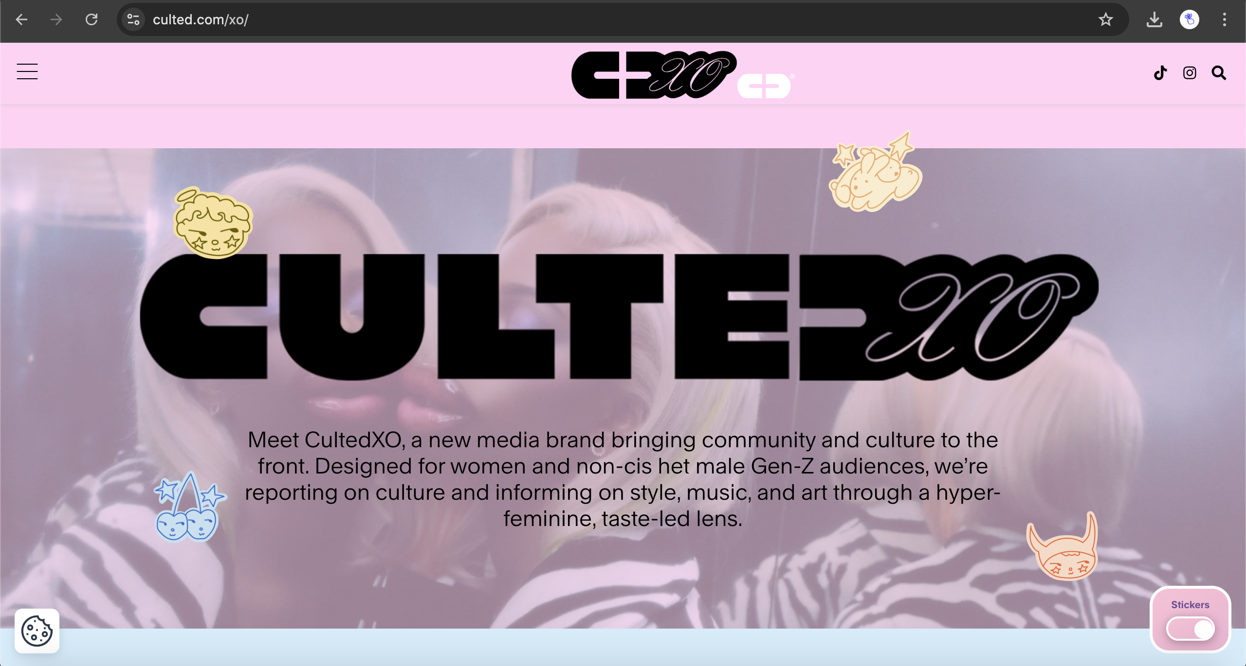 Culted XO is Culted’s Gen-Z–focused media platform, designed primarily for women + non-cis het male audiences, and centred on community and contemporary culture across style, music, and art. I helped build Culted XO’s visual identity and branding, working across logo design, typography, and colour to define its editorial and digital presence. Alongside this, I created a custom sticker pack, now used throughout the website as a recurring visual language.